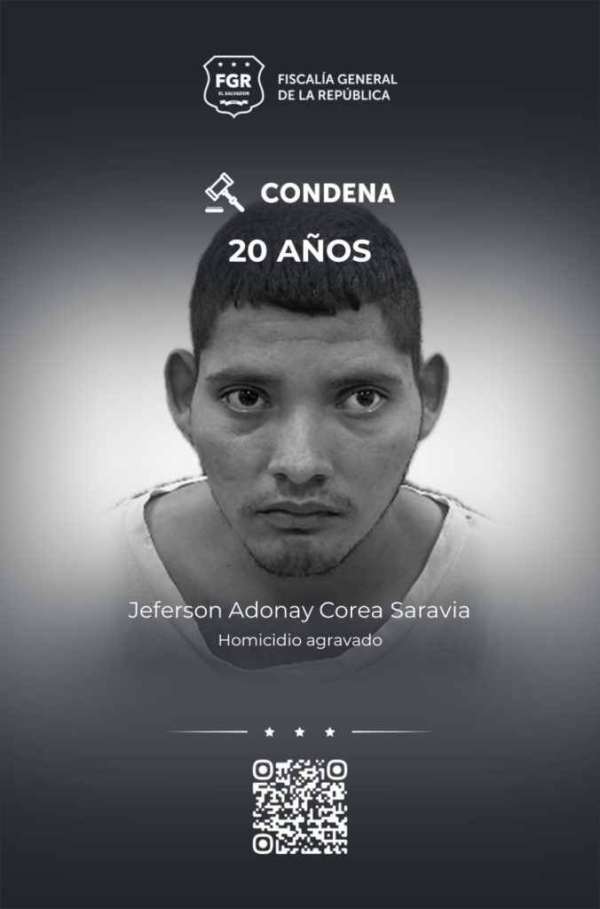 A 20 años de cárcel fue sentenciado Jeferson Adonay Corea Saravia, luego que la FGR demostrara que asesinó a un hombre en El Tránsito, San Miguel; de acuerdo con los hechos, el autor del asesinato, junto a otro sujeto (quien ya fue condenado), atacó a la persona con un machete, dejando una herida grave en la cabeza y cuello, lo cual le provocó una muerte inmediatamente.