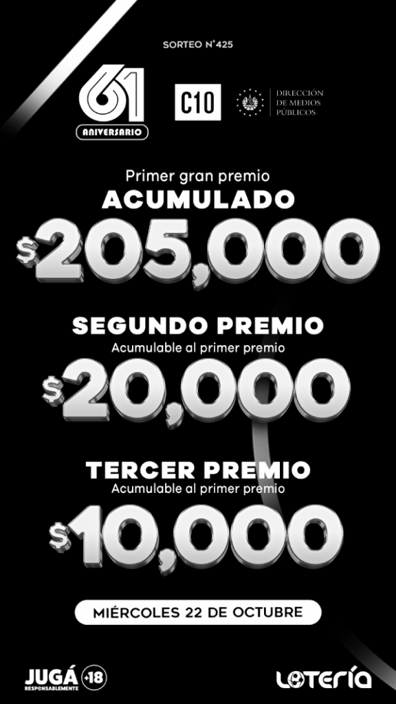 Recuerde seguir cada miércoles las transmisiones en vivo a las 12:30 p.m. por Facebook, Instagram, YouTube y en nuestra web, también podés escucharnos a las 2:00 p.m. por Radio El Salvador y ver el resumen de los principales premios a las 5:30 p. m. en Canal 10.