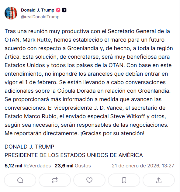 El anuncio lo hizo en Truth Social luego de reunirse en Davos con el secretario general de la OTAN, Mark Rutte. Trump no dio detalles del entendimiento y señaló que las conversaciones continuarán.